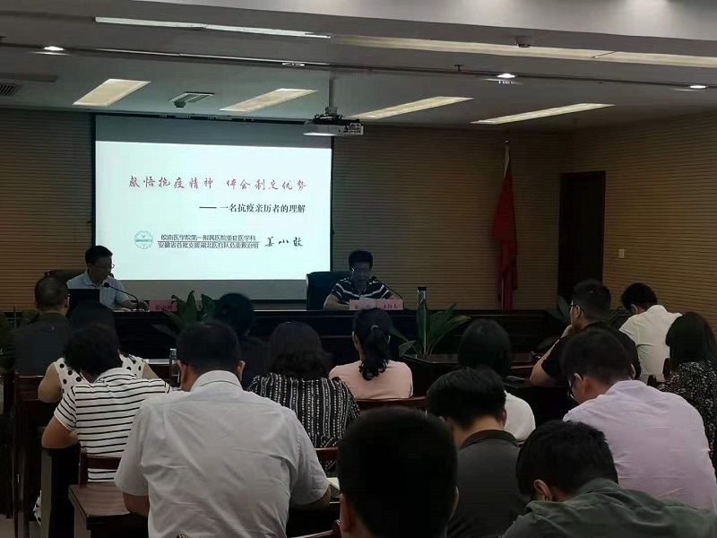 作為安徽首批援鄂醫(yī)療隊(duì)總負(fù)責(zé)人,姜小敢主任曾帶領(lǐng)團(tuán)隊(duì)分別在武漢太康醫(yī)院、協(xié)和東西湖醫(yī)院、肺科醫(yī)院開展了“疫情阻擊戰(zhàn)”、“疫情圍剿戰(zhàn)”和“疫情殲滅戰(zhàn)”。姜主任從抗疫經(jīng)歷回顧、感悟抗疫精神、體會(huì)制度優(yōu)勢(shì)等三方面回顧和分享了他馳援武漢抗擊疫情的經(jīng)歷和體會(huì)。一幅幅身臨一線的圖片、一段段飽含深情的話語,生動(dòng)再現(xiàn)了疫情發(fā)生后,全國各地醫(yī)護(hù)人員、防疫人員、共產(chǎn)黨員及社會(huì)各界不怕危險(xiǎn)、不怕犧牲,筑起防御病毒的堅(jiān)強(qiáng)堡壘的感人事跡。那一段段用生命守望生命的故事讓現(xiàn)場(chǎng)的每位聆聽者心靈都受到強(qiáng)烈震撼和感動(dòng)。